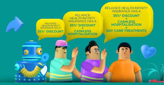 | | T&C apply. *Maximum discount applicable on this policy is up to 35% with 5% on vaccination and 10% each for other discount components. The mailer contains only an indication of the cover offered under Reliance Health Infinity Insurance. For complete details on the benefits, coverages, terms & conditions and exclusion visit the website www.reliancegeneral.co.in or read the sales brochure, prospectus, policy wording before concluding sale. IRDAI Registration No. 103. Reliance General Insurance Company Limited. Registered & Corporate Office at 6th Floor, Oberoi Commerz, International Business Park, Oberoi Garden City, Off. Western Express Highway, Goregaon (E), Mumbai- 400063. Corporate Identity Number: U66603MH2000PLC128300.Reliance Health Infinity Insurance UIN: RELHLIP21521V032021. Trade Logo displayed above belongs to Anil Dhirubhai Ambani Ventures Private Limited and used by Reliance General Insurance Company Limited under License. RGI/OS/HEALTHINFINITY-MAILER/Ver. 1.0/310721. Unsubscribe | |